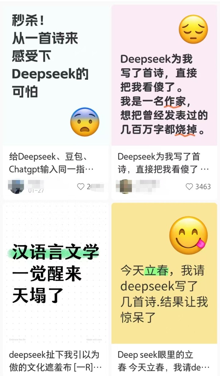 如今,面对DeepSeek的作诗能力,这种自信心正在被瓦解。一位自称作家的网友表示,“DeepSeek为我写了首诗,看完想把曾经发表过的几百万字都烧掉。”也有文学爱好者感叹,“作家梦被AI碾成碎片”。