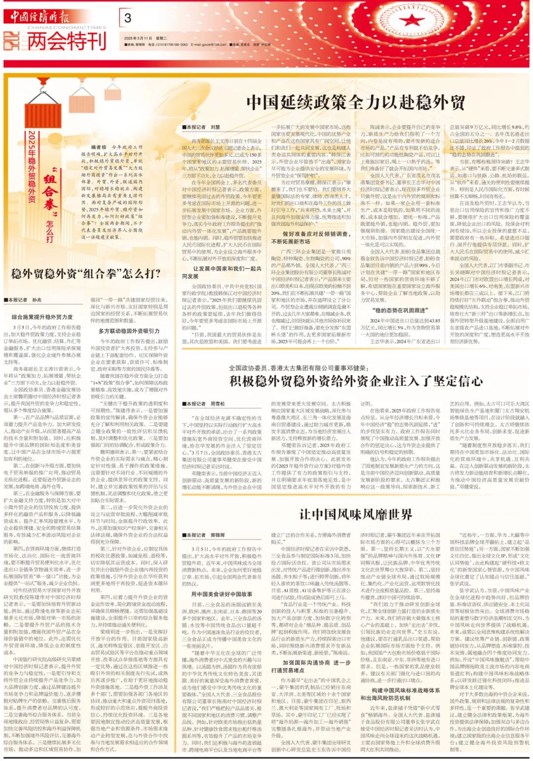 编者按今年政府工作报告明确,扩大高水平对外开放,积极稳外贸稳外资,并就“稳定对外贸易发展”“大力鼓励外商投资”作出一系列具体部署。外贸、外资,联通国内国际,对稳增长稳就业、构建新发展格局具有重要支撑作用。面对复杂严峻的国际形势,2025年稳外贸、稳外资如何再发力,如何打好政策“组合拳”?全国两会期间,不少代表委员及经济界人士围绕这一话题建言献策。